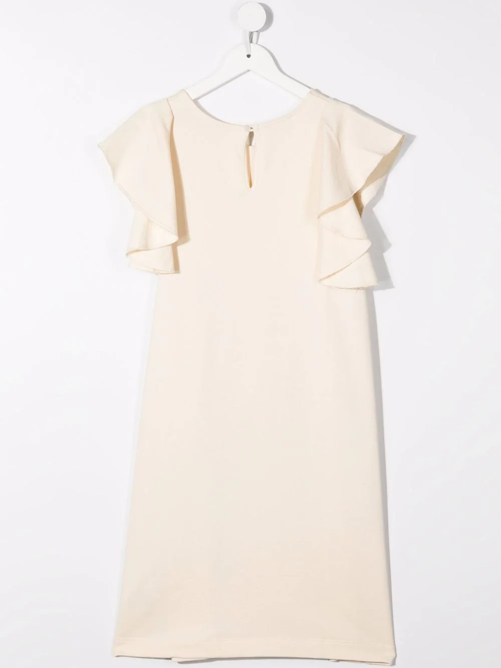 Stampa a cuori, scollo rotondo, maniche corte drappeggiate, apertura a goccia sul retro e chiusura posteriore con bottone. Materiale: cotone.