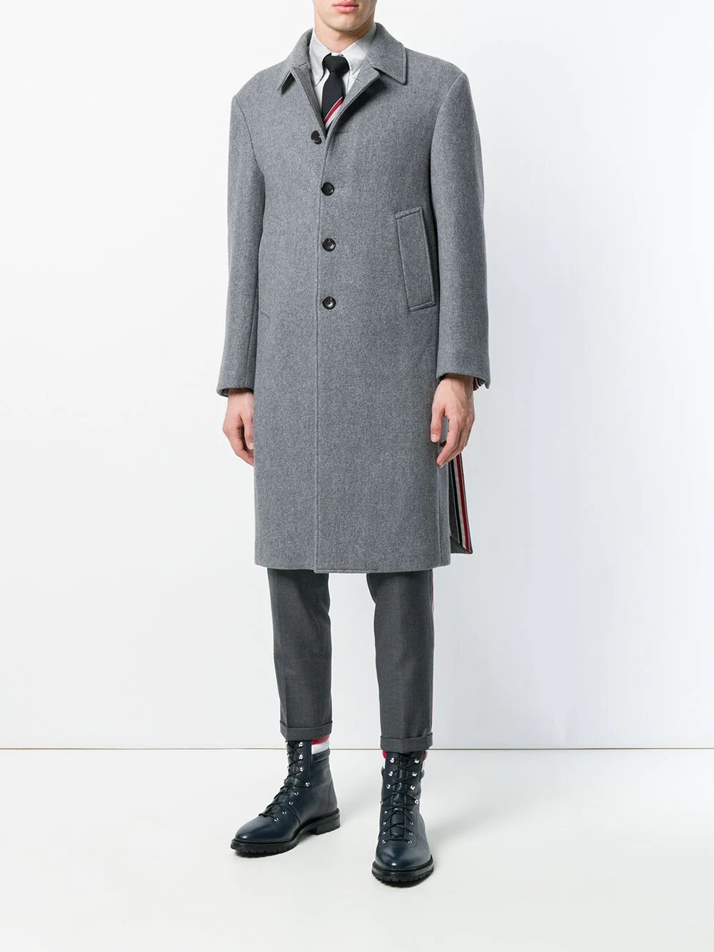 Soprabito con vestibilità comoda di colore grigio di THOM BROWNE. Modello con colletto classico, abbottonatura frontale, maniche lunghe, polsini con bottone, tasche laterali a soffietto e doppio spacco centrale posteriore.
